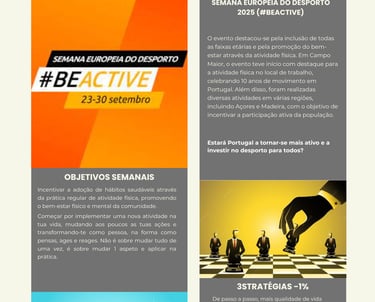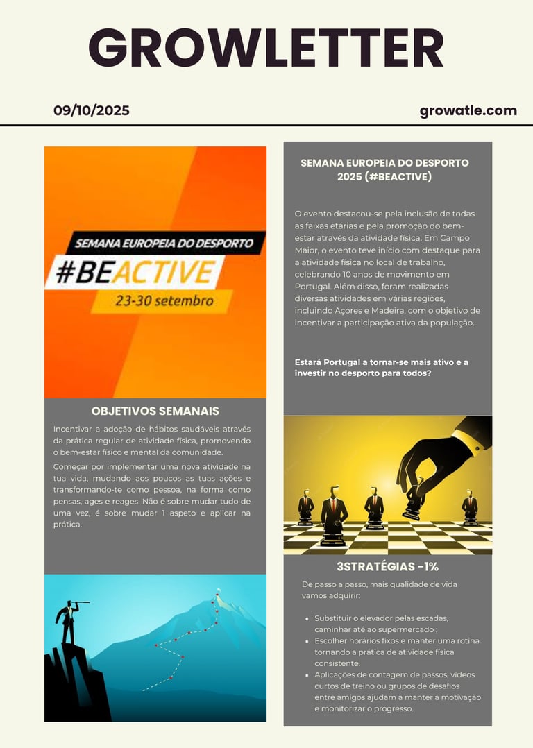 A última semana de Setembro contou com a Semana Europeia do Desporto realizada em Campo Maior e teve a presença de todas as faixas etárias, experiências novas e muita diversão e entretenimento. A saúde deve ser vista como algo fundamental, prioritário e o motor da nossa vida.
