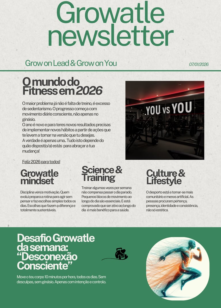 Esta edição da Growatle foca-se no que realmente constrói progresso no desporto e no desenvolvimento pessoal. Sem atalhos. Sem desculpas. Apenas com foco na mudança do ano para acompanhar a mudança de vida da melhor versão possível!