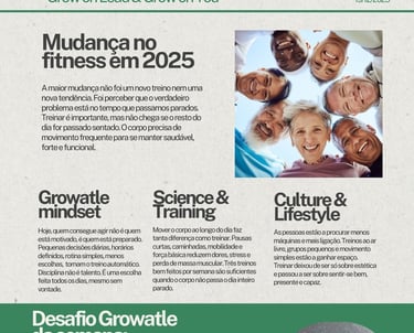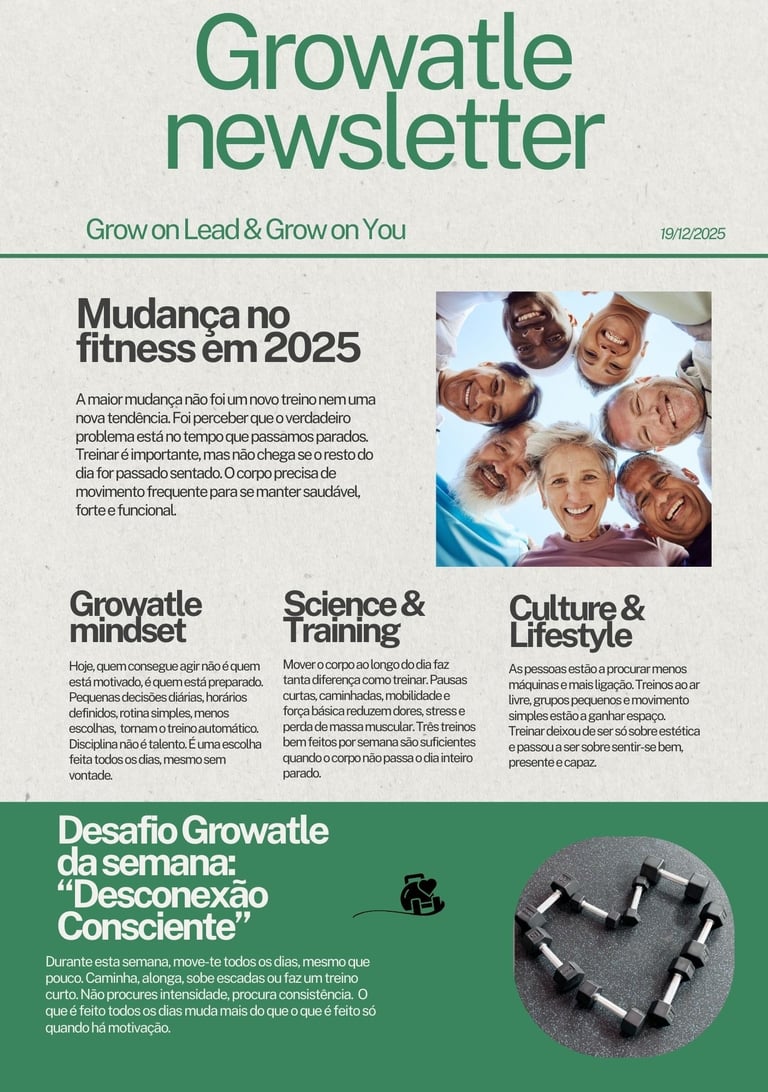 Esta edição da Growatle newsletter aborda a importância do movimento diário para além do treino tradicional, mostrando porque ficar demasiado tempo parado compromete tanto a saúde física como a mental. Resume as principais evidências recentes sobre força, mobilidade e consistência, explicando de forma simples o que realmente faz diferença no dia a dia. Explora a mudança de mentalidade necessária para manter hábitos, mesmo sem motivação. Destaca também a evolução do treino como estilo de vida e não apenas como estética. Termina com um desafio prático focado em consistência, movimento consciente e ação diária.
